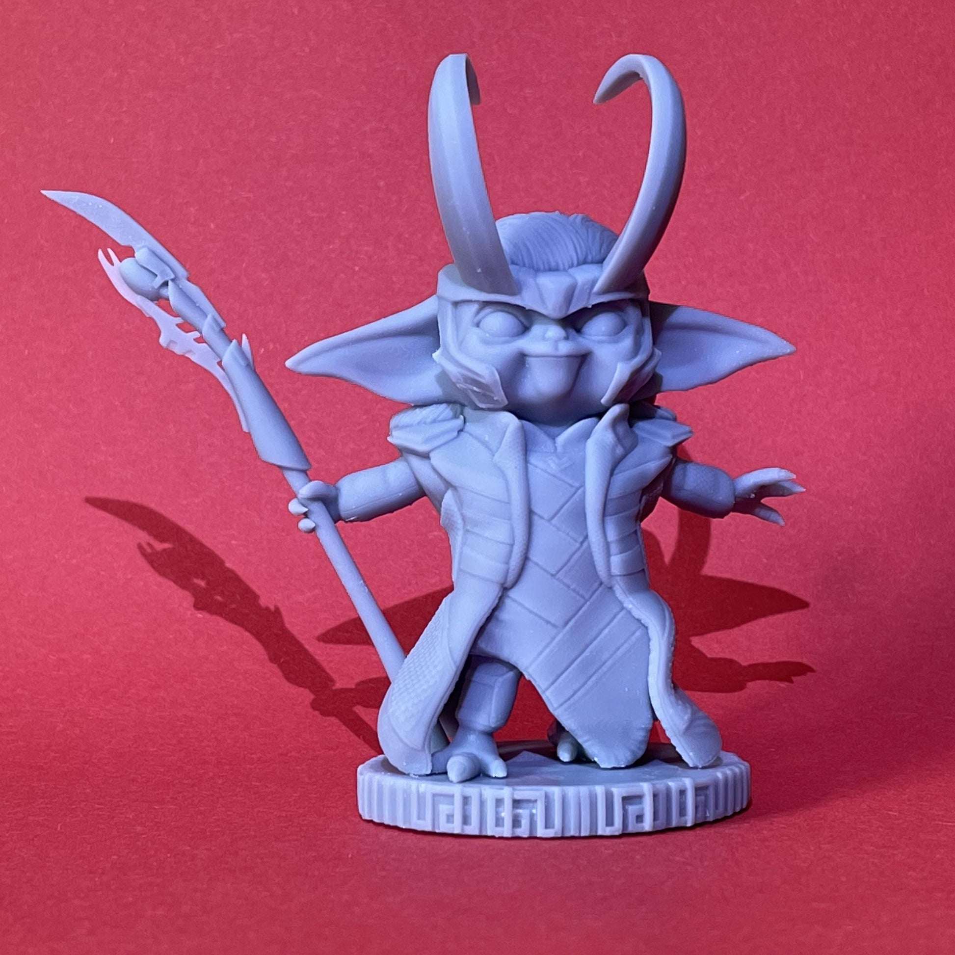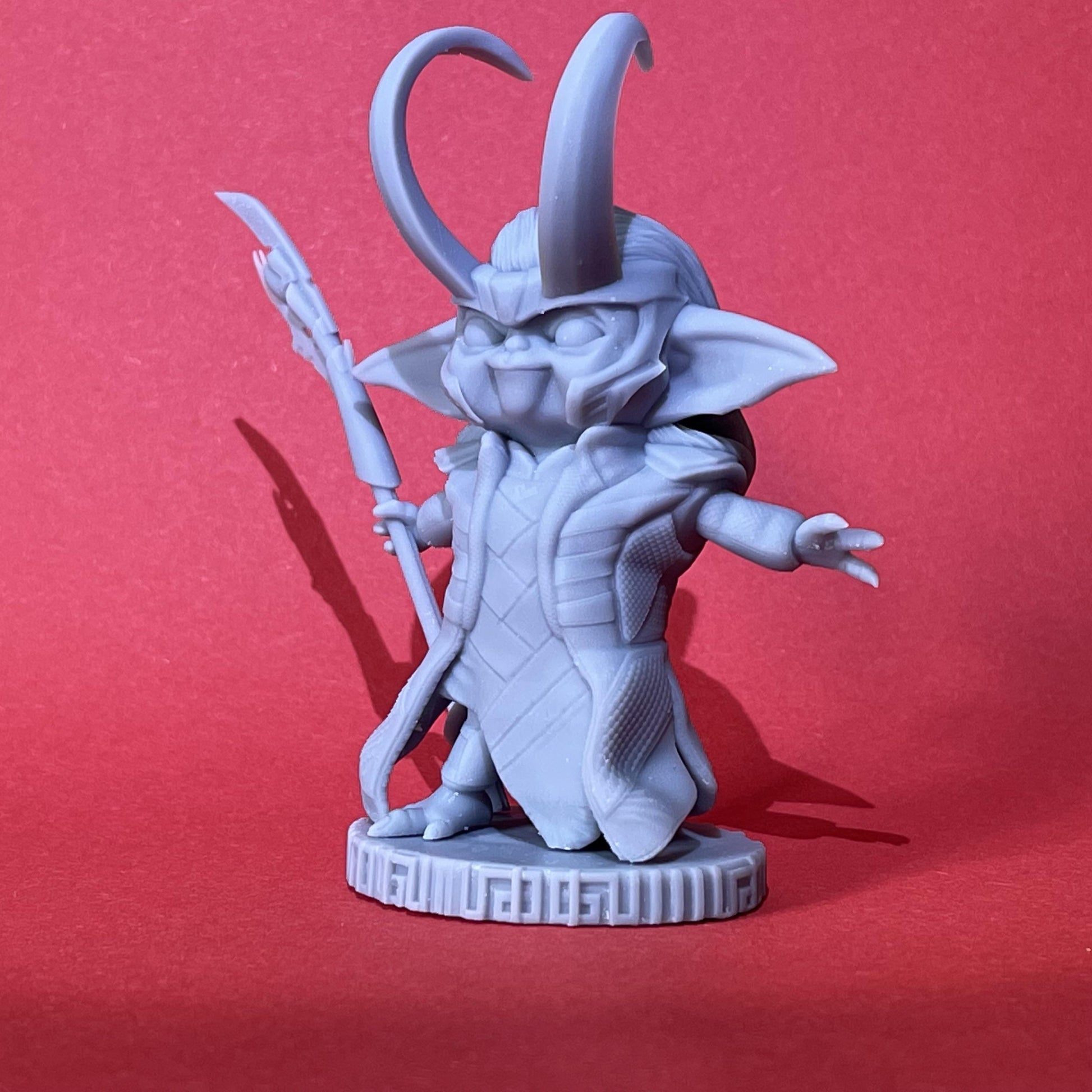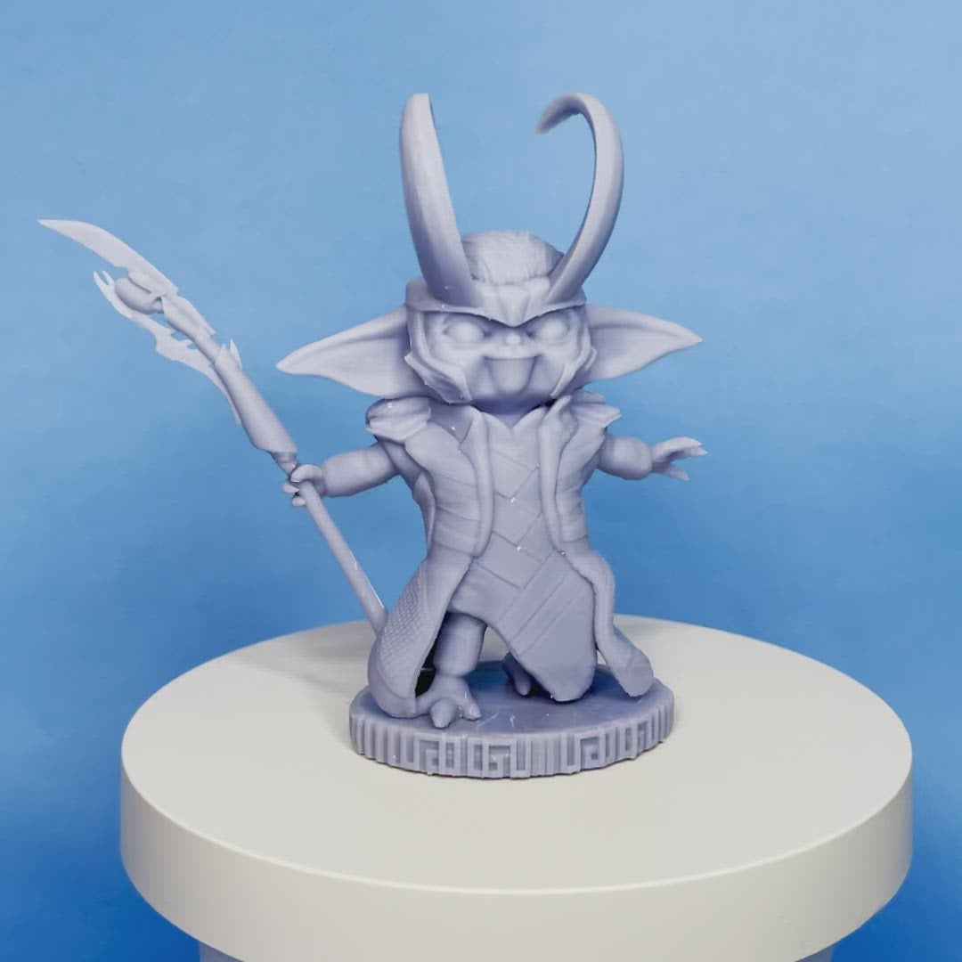 The Groki Figurine brings together the best of two fan-favorite characters, Grogu and Loki, to create a unique and playful design that is sure to delight fans of all ages. With Grogu's large ears and Loki's horned crown, this figurine is the perfect addition to any display shelf or desk.